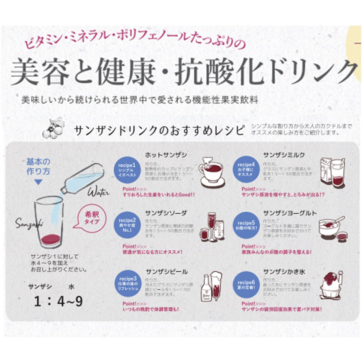 サンザシ1に対して、水4~9を加えお召し上がりください。