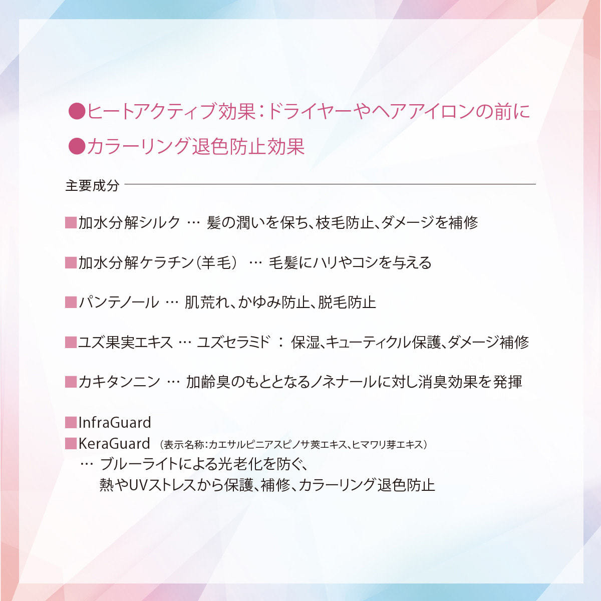 ●InfraGuard&KeraGuard:ブルーライトによる光老化を防ぐ、熱やUVストレスから保護、補修、カラーリング退色防止