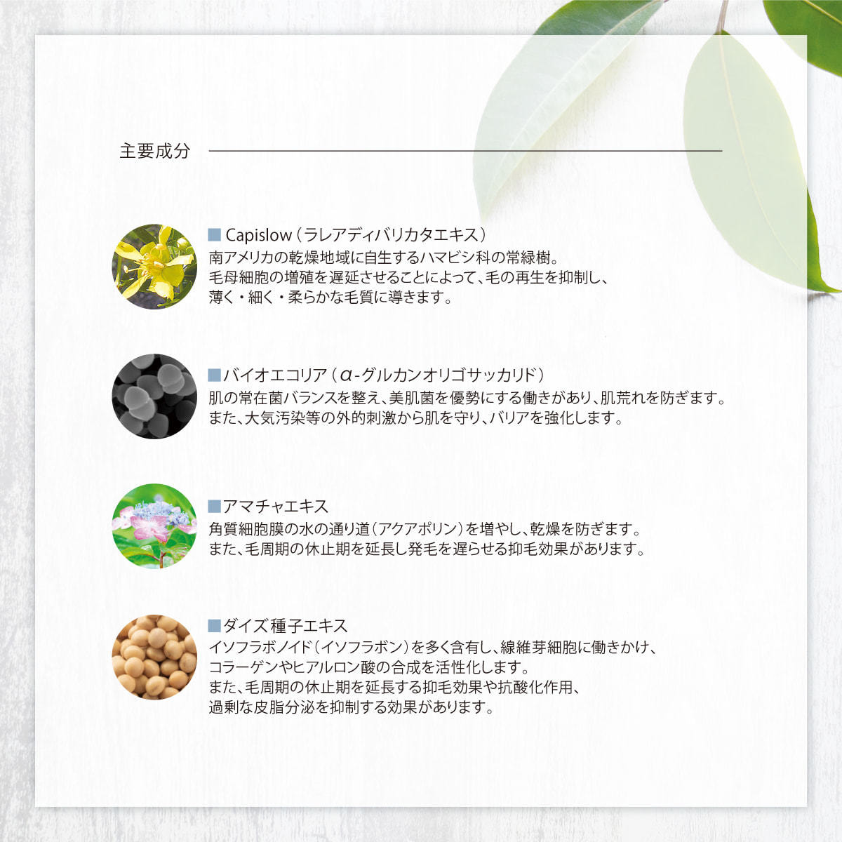 南アメリカの乾燥地域に自生するハマビシ科の常緑樹。毛母細胞の増殖を遅延させることによって、毛の再生を抑制し、薄く・細く・柔らかな毛質に導きます。